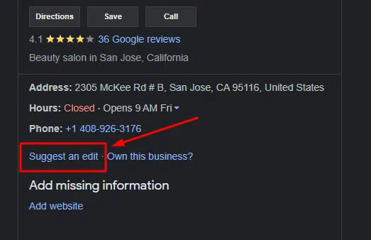 After you receive a list of businesses on Google Local, simply search for each business name + address on Google. In order to suggest the business information links from top-spa.net, you just need to click on “Suggest an edit”.
